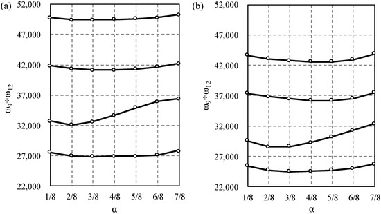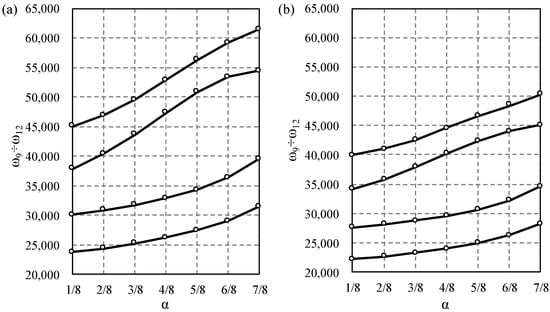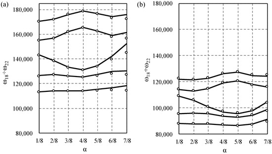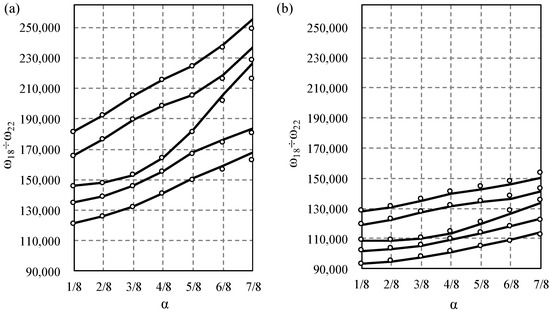 When increasing this parameter from its lowest to the highest value, the relative differences increase as well. However, up to the fifth form of vibration, these differences do not exceed 5%. For the sixth form, these values range from for to for . For the 10th mode, the differences range from 11% to 21%. Generally, for the higher frequencies, the relative frequencies increase faster.