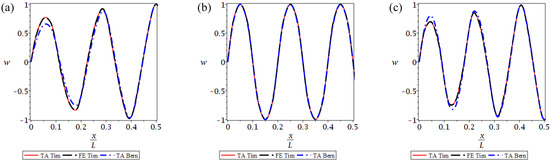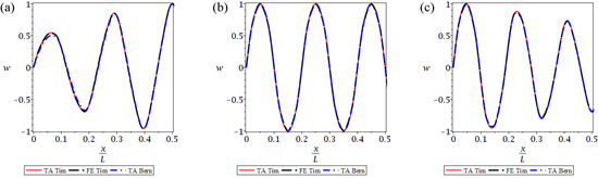 The 9th (a), 10th (b) and 11th (c) natural vibration modes presented for the left half of the beam, for a bi-material beam for the TA and FE Timoshenko beam models and for the TA Bernoulli model.