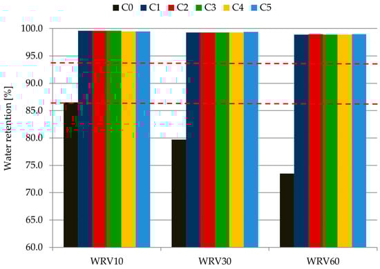 Table 5 and Figure 3 present the results of the water retention values WRV10, WRV30 and WRV60 (the tests were made after 10, 30 and 60 min measurements).