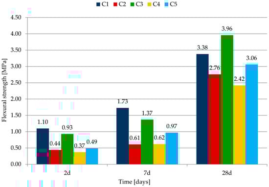 The strength measurements were done after 2, 7 and 28 days of curing. The values from three bars (flexural strength) or six bars (compressive strength) were calculated as an average. The results for flexural strength are shown in Table 7 and in Figure 5.