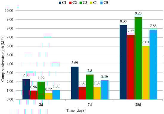 Mortar C1 with cement CEM I 42.5 R (cement without addition) is characterized by the highest strength after 2 and 7 days of maturation. The early strength of the mortars C2–C5 was lower than that of the reference sample C1—the difference after 2 days of maturing was in the range of 15% to 66%. This was a result of the type of binder (class of cement and type of addition). The use of cement CEM II/B-V 42.5 R as cement CEM I 42.5 R replacement brings about strength increase at a later age. Mortar C3 (with cement CEM II/B-V 42.5 R) has the highest strength after 28 days.