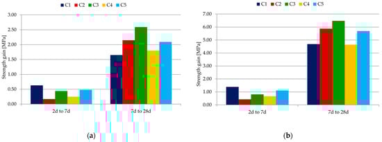 Table 8 and Table 9 show a comparison of the strength in relation to the reference mortar (C1); the results are given as a percentage. Changes in the increment of flexural and compressive strength in MPa were also determined, relating the strength results obtained after 7 and 28 days to the test results after 2 days of specimen maturation. Figure 7a,b shows the gain of flexural and compressive strength over time.