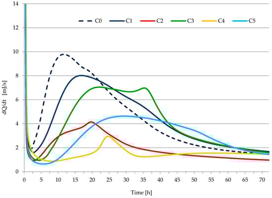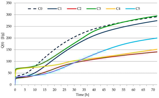 In the case of the C0 paste, the typical course of the heat release curve during the hydration of Portland cement is visible. During this process, the highest indications for the deepened heat effect related to the hydration of alite and tricalcium aluminate [13,43] were achieved, and at the same time the shortest induction period. Cellulose ether admixture caused an extension of the induction period and a delay and suppression of the main heat release peak. As a result, the amount of heat release during hydration was reduced. The use of mineral additions in the cement (fly ash and ground granulated blast-furnace slag) caused longer shifts in time and reduced the occurrence of the main thermal effect as well as extending the induction period. This is usually related to the reduction of the cumulative amount of heat released. The amount of exhausted heat exceeded that determined for the Portland cement samples (C0 and C1) only in the case of sample C3. It is related to the occurrence of an additional, clear effect with a maximum recorded after about 37 h of hydration. It can be explained by the formation of calcium silicates rich in silicon, resulting from the initiation of the pozzolanic reaction [12,13,38,43,44,45].