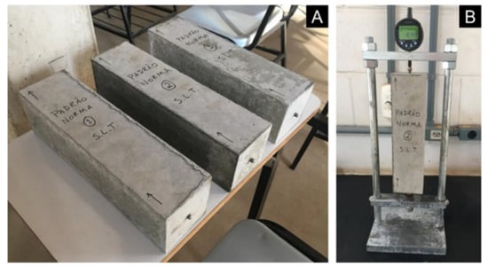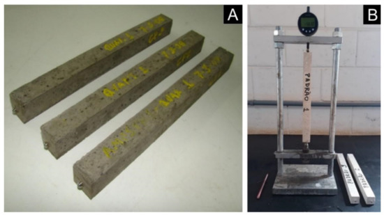 The accelerated test method, recommended by NBR 15577-4 [25] and ASTM C1260 [21], determines through variation in length (expansion) of mortar bars (Figure 2) the susceptibility of an aggregate to participate in the alkali–silica expansive reaction in the presence of hydroxyl ions combined with cement alkalis. Three mortar bars were produced in the dimensions of 25 × 25 × 285 mm3 with a fixed mix ratio at 1:2.25:0.47 for each of the eight samples of aggregates and subjected to alkali attack in a NaOH solution at a temperature of 80 °C.