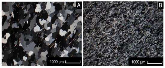 Photomicrographs (crossed nicols). (A) STL quartzite showing the granoblastic arrangement of quartz crystals and foliation marked by the alignment of muscovites; (B) ALP quartzite with the same textural arrangement but with considerably smaller grain size.