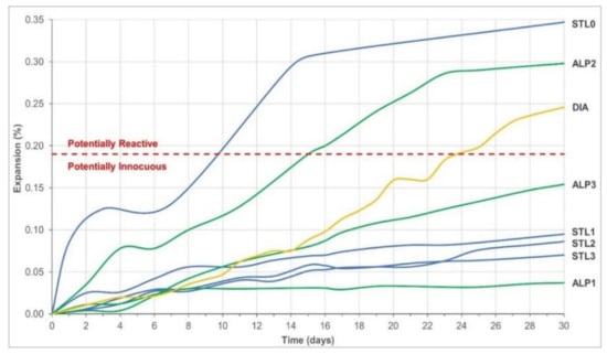- ABNT (Associação Brasileira de Normas Técnicas). NBR 15577-6 Aggregates—Alkali-aggregate reactivity. In Part 6: Determination of Expansion on Concrete Prisms; ABNT: Rio de Janeiro, Brazil, 2018. (In Portuguese) [Google Scholar]