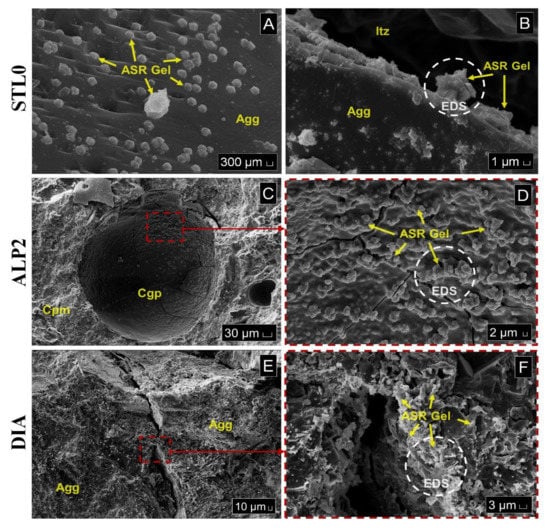 Mortar bar microstructure by SEM analysis. STL0: (A) Gels developed and adhered to the edge of the Agg aggregate. (B) Gels being formed on the aggregate surface close to the Itz interface transition zone; ALP2: (C) Cgp Cracked solid gel products adhered to the pore surface around Cpm cement paste matrix. (D) Detail showing the appearance of the cracked and botryoidal gel; DIA: (E) Fracture interface where the investigations were carried out. (F) Gel deposits on the aggregate surface caused by ASR.