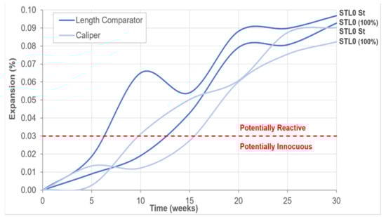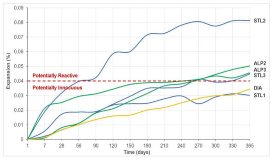 It is important to inform that, in other studies, some methods were tested increasing the analysis time in order to check the expansive behavior in more advanced ages. As an example, Yuksel et al. [37] evaluated concrete prisms with siliceous aggregates (glass residues) and verified the low expansion behavior at 365 days, but with the advancement of analyses up to the age of 1095 days (3 years), these authors found that some samples fell into the class of reactive potential with values above 0.04% expansion.