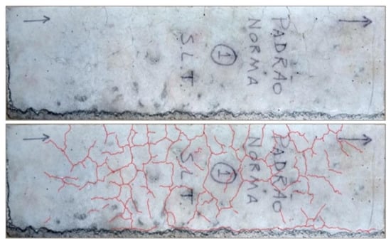 Figure 9 shows the average expansion of two samples, six concrete prisms produced with 100% fine and coarse quartzite aggregate (STL0 100%) and three concrete prisms produced according to the normative standard (STL0 St). Expansion measures of concrete prisms were taken with a length comparator coupled to the measuring apparatus and comparative readings were also taken with the aid of a digital caliper. Although NBR 15577-7 [27] recommends taking the readings until the age of 20 weeks, it was decided to extend the readings until the age of 30 weeks. All analyzed concrete prisms showed a potentially reactive behavior, with expansions greater than 0.03%. The STL0 sample (100%) did not show any spans, and few signs of fissures were observed on the prism surface. The sample expansion results showed similarity with the use of the two types of measurements used. In the STL0 St sample, it was possible to observe narrow spans and generalized cracks on the prism surfaces (Figure 10). The expansion results of this sample, using the two types of measurements, showed divergences up to the age of 20 weeks, but at the ages of 25 and 30 weeks, the results started to look similar, with a progressive growth. For these reasons, samples were subjected to SEM analysis. Studies carried out by Fournier et al. [38],Wallau et al. [30] and Sanches et al. [31], in concrete samples subjected to accelerated testing using different lithological types of aggregates (including quartzites), showed that this method can be considered reliable for the interpretation of alkali–aggregate reactivity, as the results obtained were consistent with the degree of deleterious potential of the analyzed samples.