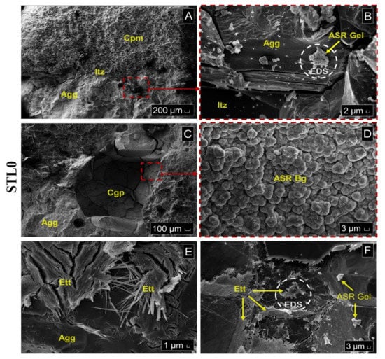 SEM analysis of the microstructure of mortar bars. STL0 St sample: (A) Investigated Itz interface transition zone; (B) Gel deposits on the Agg aggregate surface caused by ASR; (C) Cgp solid cracked gel products adhered to the pore surface; (D) Aspect of the Bg botryoidal gel adhered to the pore surface; (E) Ett ettringite formation on the aggregate surface. STL0 (100%) sample: (F) Typical products of ASR and ettringite formation on the aggregate surface.