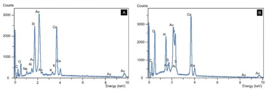 During the microscopic investigations and the EDS analysis performed on mortar bars, it was possible to observe in the STL0 sample, characteristic products of crystallized gels adhered to the edge of the aggregate and the typical generalized formation of ASR silica gels on the aggregate surface (Figure 6A,B). In the ALP2 sample, a pore with the appearance of a solid cracked gel was identified (Figure 6C) and, after image magnification, the cracked fissures and the formation of botryoidal gel, typical of ASR, were verified (Figure 6D). The EDS spectrum analysis showed that the crystalline products generated on the aggregate surface are ASR silica gels (Figure 7A,B). The DIA diabase microstructure images were collected inside the fissure region in the sample, where the widespread presence of crystallized products was found (Figure 6E,F). These crystals were subjected to EDS analysis and the hypothesis of the formation of the ASR silico–calco–alkaline gels was confirmed (Figure 7C).