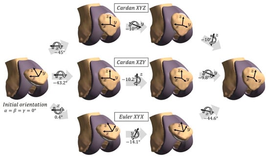 In biomechanical literature, sometimes an intrinsic sequence of rotations around three different axes is called an Euler rotation, and the associated angles are termed Euler angles [,]. The correct term for these angles is in fact Cardan angles or Tait-Bryan-angles. Actual Euler angles are an intrinsic rotation sequence, which uses the same axis for the first and the third rotation (e.g., rotations around the axes ξ, η’, ξ’’) []. While Cardan angles can be used for a biomechanical description of patello-femoral rotations, Euler angles are difficult to relate to the clinical terms of patellar flexion, spin and tilt. Figure 2 shows three different rotation sequences which lead to a particular patellar orientation.
