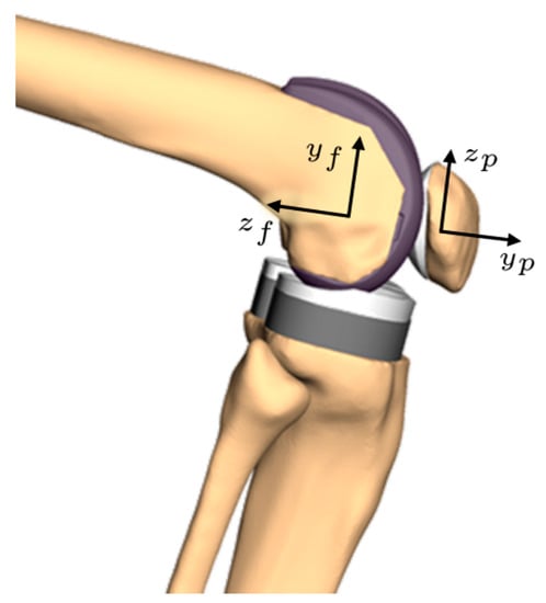 In the following description, two reference frames will mainly be used: one attached to the femur and another to the patella, with the directions x, y and z pointing laterally, anteriorly and proximally, respectively, in full extension. If the femur or patella rotate and translate during flexion, the attached coordinate systems will follow the bones’ movements. Figure 1 shows a possible system of axes for the patellar kinematics. Since the exact orientation depends on the chosen definition, it is neither described nor shown in more detail. The question of how these directions can be identified, i.e., which landmarks can be used, is highly dependent on the data and the measurement methods of every single study and will therefore not be deeply discussed. A possibility to define a reference frame for the patella is presented and validated by Innocenti et al. [].