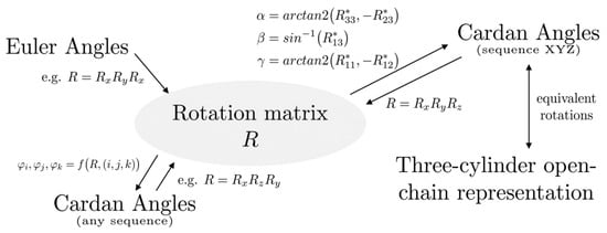 As stated previously, the angles in the three-cylinder open-chain representation [,] are equivalent to the angles of the intrinsic XYZ rotation sequence. Therefore, the methods used for this sequence can also be applied to convert rotations from or into this convention.