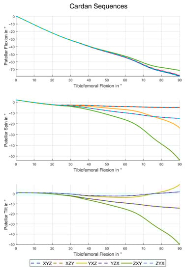 Figure 5 shows the rotation angles for all possible Cardan sequences. The choice of definition has a minor effect on the patellar flexion values. All Cardan sequences except for ZXY have very similar flexion angles. The maximum RMSE within this group is 0.79° (see also Table 1). The patellar flexion angle of the ZXY-sequence differs up to 7.83° from the others (RMSE ≥ 3.71°).