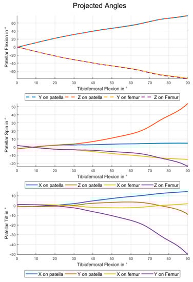 For small angles of spin and tilt the projected angles for flexion on the patellar (or femoral) planes can be interpreted as flexion with respect to the patellar (or femoral) system. Due to the high flexion angles, the same interpretation cannot be applied to spin and tilt. For spin and tilt the values are also highly depending on the choice of axis for projection.