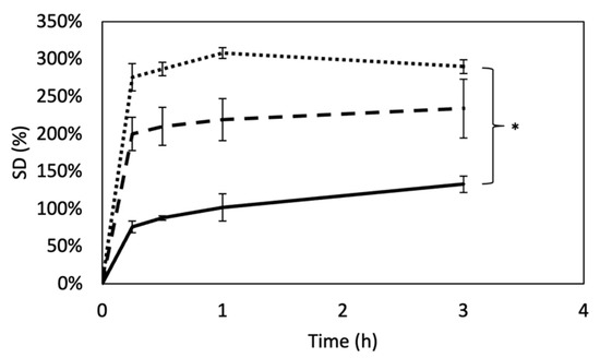 Swelling degree curves of DHT (dotted line), DHT/EDC (dashed line) and SIS patch (continuous line). Values indicated represent mean ± SD, where n = 3. Statistical analysis: Student’s t-test (* p < 0.01).