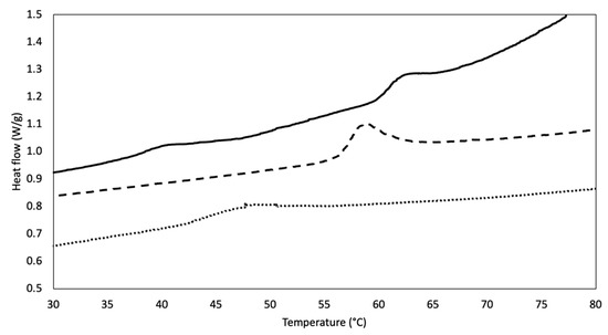 DSC thermograms representative of DHT (dotted line) and DHT/EDC (dashed line) substrates in comparison with the SIS patch (continuous line).
