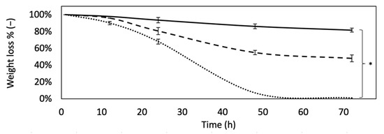 where Wt is the residual mass of the sample at time t and W0 is the initial mass. Moreover, a single exponential decay rule (Equation (3)), reported for enzymatic degradation, was used to determine the in vitro half-life of the substrates, that is, the time t1/2 at which Wt/W0 = 0.5 [50,63].