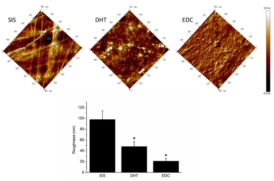 Representative AFM topographical acquisitions of different DHT and DHT/EDC substrates in comparison with SIS patch. In the histogram, the roughness (Rq) values were reported as mean value with their standard deviations. Statistical analysis: ANOVA test (* p < 0.001).