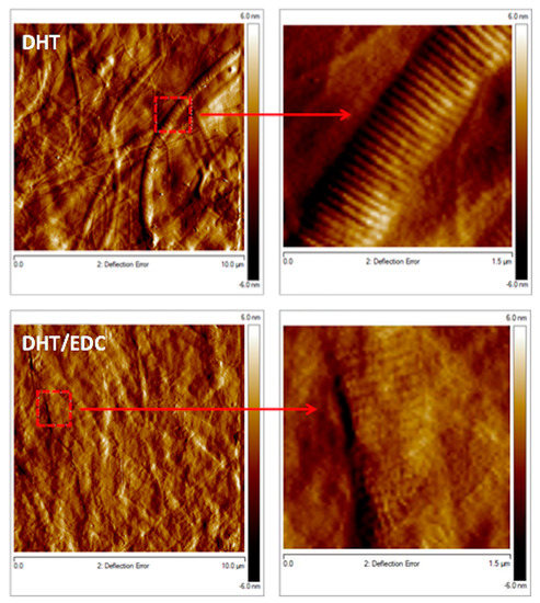 In Figure 7, acquisitions at higher magnifications revealed the presence of long and randomly oriented collagen fibrils for both DHT and DHT/EDC films, confirming that the zero-length crosslinking treatments applied did not alter type I collagen native structure. Moreover, with a focus on D-banding pattern, a slight and insignificant change in fibrils D-period emerged (DHT: 61 ± 10 nm; DHT/EDC: 57 ± 14 nm, p > 0.05), confirming that the synthesis technique and the crosslinking strategies adopted not only did not alter the fibrillar structure of collagen, but did not induce significant shifts in the collagen natural banding of approximately 67 nm [31].