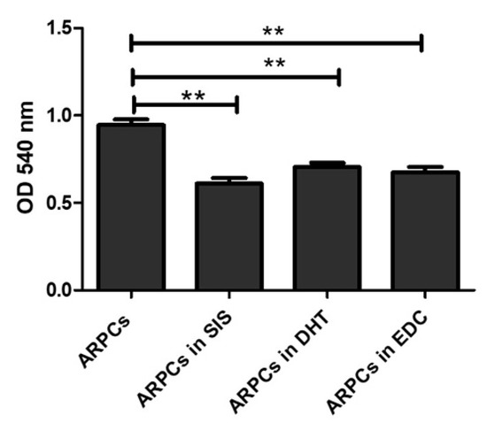 In order to study both the biocompatibility of the proposed materials and their suitability as substrates for urethral regeneration, ARPCs were cultured on the SIS, DHT and DHT/EDC substrates for 7, 14, 21 and 28 days. First of all, cell proliferation and viability were quantitatively evaluated in the three kinds of films at 72 h. The MTT assay was used to measure cellular metabolic activity as an indicator of cell viability, proliferation and cytotoxicity. As reported in Figure 9, no significant differences in ARPC growth on DHT and DHT/EDC films compared to the SIS patch was observed.