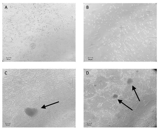 Phase-contrast microscopy images showing ARPCs growing in monolayer after 14 days of culture on DHT (A) and DHT/EDC films (B). After 21 days of culture, spheroids appeared in culture, composed of ARPCs seeded on DHT/EDC (C), and after 28 days spheroids and renal tubular like structures were observed (D). Original Magnification: 20×.