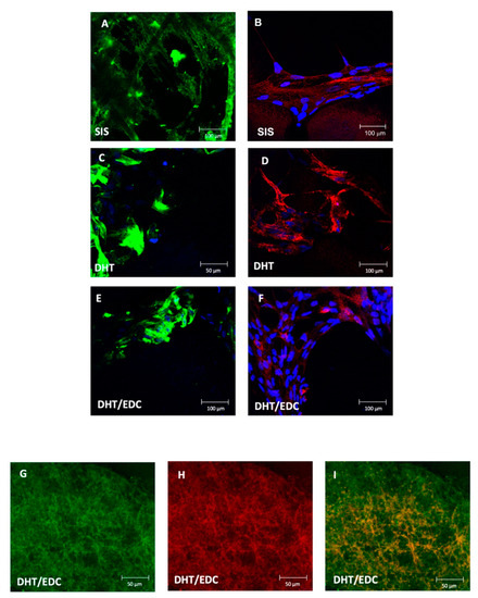 Cell-material interaction is considerably affected by surface properties. It is known that a moderate wettability is optimal for cell adhesion and proliferation [94]. The contact angle values instantly recorded on DHT and DHT/EDC substrates, being 87 ± 2° and 99 ± 3°, respectively, were comparable with the SIS patch (85 ± 6°) with no statistical differences (p = 0.50 and p = 0.06, respectively). The additional chemical crosslinking on DHT film did not significantly increase the hydrophobicity of the DHT/EDC substrate (p = 0.07). The formation of new bonding brought about a reduction in the number of chemical groups available for interaction with water molecules, which was reflected in slightly more hydrophobic behavior.