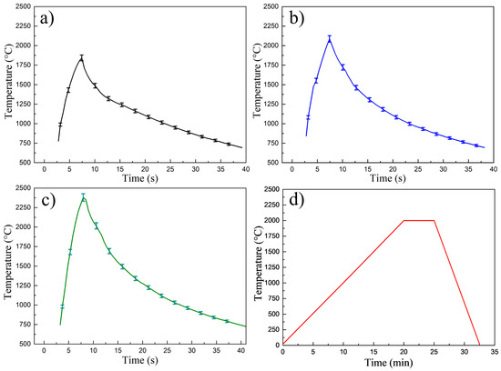 Experimentally recorded temperature profiles of (a) UFS 1, (b) UFS 2, (c) UFS 3 (temperature probing point T1 was 8 mm from the sample see Figure 4b, (d) SPS 4. Note the different time scales between SPS and UFS.