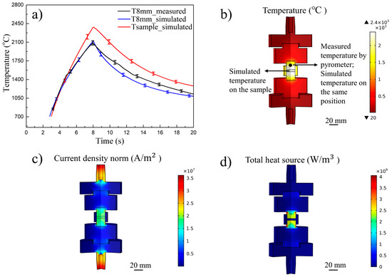 The UFS process was simulated accounting for temperature, current and electrical power dissipation. The simulated temperature the gradient center to edge was below 100 °C. The hardness measured along the radial direction was within the scatter of the measurement. For example, the temperature curves measured and estimated in sample UFS 2 are shown in Figure 4a. One can observe that the simulated temperature at 8 mm from the sample well-matches the one measured with the pyrometer, thus validating the results of the simulations. The current and energy density distribution during the process are shown in Figure 4c,d, they reached values up to and .
