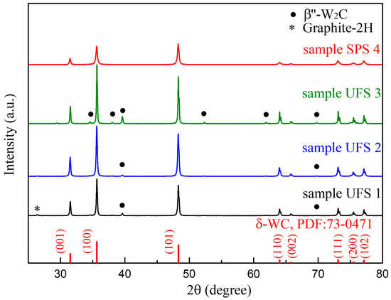 The composition of samples was analyzed with X-ray powder diffraction, as shown in Figure 6. The corresponding mass percentage of each phase along with relative density and hardness are shown in Table 2. Recalling the W-C phase diagram proposed by Kurlov and Gusev [52], the sample UFS 1 might have experienced the polymorphic transformation occurring ℃ and subsequently eutectoid decomposition upon cooling . The latter seems in good agreement with the pronounced formation of graphitic carbon and the microstructural observation reflection the formation of hot spots seen in Figure 5a. On the contrary, the simulated temperature for samples UFS 2 (2383 ± 46) and UFS 3 (2753 ± 54 °C) might not have exceeded the polymorphic transformation responsible for the graphite formation. These results also suggest the possibility to use the polymorphic phase transformation to calibrate the FEM model. Samples were UFS 2 and SPS 4 had comparable hardness and were mostly composed of . Sample UFS 3, despite the high relative density of 98.1% had a low Vickers hardness of 1576 because of the extensive formation of (reference Vickers hardness of 12 GPa ≈ 1224 HV) [53]. Analyzing the sample produced in the study, SPS process was about 200 times longer than UFS and it consumed about 40 times more energy. Therefore, UFS process is highly energy efficient.