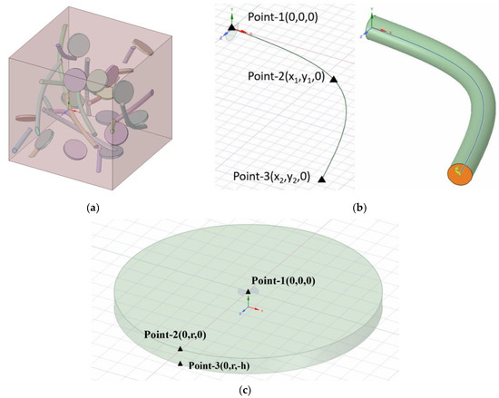 This model has regular geometric parts. When modeling a cylinder using the script in SpaceClaim, three feature points are needed to generate the cylinder at the coordinate origin, as shown in Figure 1c. The diameter and thickness of GNPs are determined according to the specific experimental content. Three sets of 0–50 random numbers are generated, corresponding to the displacement of graphene from the origin X, Y, and Z directions. Similarly, three sets of 0–180 random numbers are generated, corresponding to the rotation angle of each unit of graphene with x-, y-, and z-axes as the axis of rotation. After calculation, the spatial location of the generated GNPs can be determined and the data summarized into a characteristic point data group for follow-up studies.