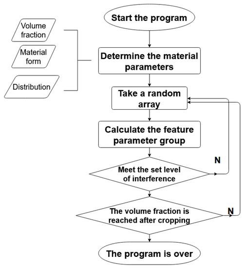 To realize the automatic generation of the composite RVE geometric model, the morphology of GNPs and CNTs, the distribution of GNPs and CNTs in the substrate, and the degree of interference between GNPs and CNTs and the substrate must be determined. The automatic generation algorithm flowchart for the composite RVE model is shown in Figure 2.