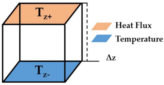 where qz is the constant heat applied on the face, Δz is the size of the matrix, Tz+ is the average temperature of the face where heat flux was imposed, and Tz− is the average temperature of the face where the constant temperature was imposed.