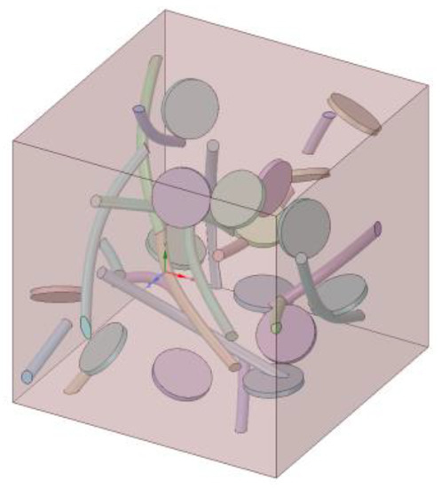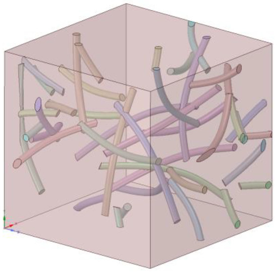 In order to explore the influence of carbon nanotubes on the thermal conductivity of carbide composites, a representative volume unit of 50 × 50 × 50 nm3 was set; the substrate of the unit was the Co phase and the carbon nanotube was the added phase. In the experiment, the parameters of the carbon nanotubes were set by default as the following: a radius of 0.8 nm, a length of 40 nm, and a bending degree of 140 degrees. Changes to the carbon nanotube morphology as specific conditions were explored. For example, Figure 4 presents a FEM simulation model with a volume fraction of 2% of a carbon nanotube.