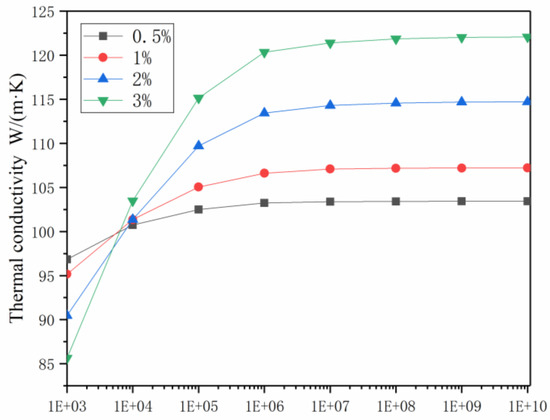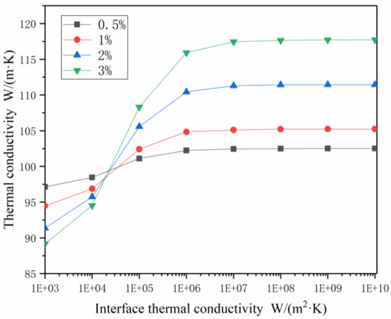 Different models were established by only changing the thickness of graphene. The volume fraction of graphene was set at 1%, and the interfacial thermal conductivity CG-Co was set at 1 × 108 W/(m2·K) with a radius of 5 nm. By changing the thickness of graphene, the diameter–thickness ratio of graphene can be changed, and the effect of the diameter–thickness ratio of graphene on the thermal conductivity of composites can be explored. As shown in Figure 10, the thinner the graphene sheet, the larger the contact area and the higher the thermal conductivity of the composites with the same volume fraction of graphene.