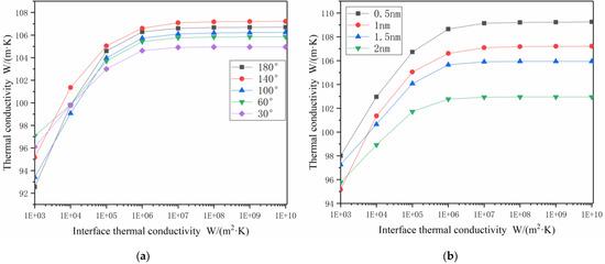 As can be seen from Figure 7b, under the same volume fractions, the smaller the radii of the carbon nanotubes, the larger the contact areas between the carbon nanotubes and Co phase, and the greater the influence factors of the interfacial thermal conductivity. Under the same amount of interfacial thermal conductivity, the larger contact areas were also more conducive to heat flow, and the thermal conductivity of the composites was higher.