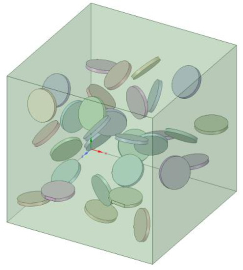 Graphene is generally prepared by acid oxidation, mechanical stripping or chemical vapor deposition. Therefore, the interfacial thermal conductivity of graphene prepared by different methods is different from that of Co phase. The number of oxygen-containing functional groups on graphene affects its thermal conductivity [24]. It is necessary to discuss the influence of interfacial thermal conductivity CG-Co on Kc and establish models with different interfacial thermal conductivity CG-Co. In these models, graphene was randomly dispersed in the model with the same shape (radius 5 nm, thickness 1 nm). Figure 8 shows an example of a 2% volume fraction FEM model of graphene.