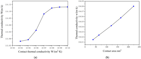 It can be seen from Figure 13a that the interface thermal conductivity of GNPs–Co and CNTs–Co had a greater influence on the thermal conductivity than that of GNPs–CNTs. Changing the contact thermal conductivity only changed the thermal conductivity from 113 to 114 W/(m·K). Although the contact thermal conductivity of graphene with carbon nanotubes was greater than that of interface thermal conductivity CC-Co and interface thermal conductivity CG-Co, the thermal conductivity between graphene and carbon nanotubes must be better than that between carbon and metal. However, the contact area between the graphene and carbon nanotubes was very different, being only 50 to 100 nm2, while the contact area between the reinforcement phase and matrix Co was 3000 nm2.