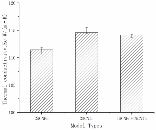 Graphene and carbon nanotubes have different shapes in the heat-affected zone of Co. Using the characteristics of their heat-affected zones, we assumed that if graphene and carbon nanotubes were evenly dispersed in the model, a tighter heat-affected zone could be formed, which would further improve the thermal conductivity of the material. The thermal conductivity of the RVE model with 1% GNPs and 1% volume fraction CNTs was calculated according to the above model, and was compared with the RVE model with 2% volume fraction graphene and the RVE model with 2% volume fraction CNTs. The results are shown in Figure 14.