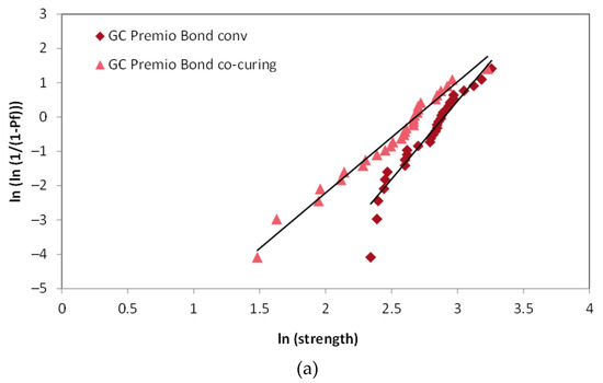Weibull diagrams for the conventional and co-curing method of application for all three adhesive systems used in the study. Slopes of the fit lines represent Weibull modulus. (a) GC Premio Bond, (b) Prime&Bond, (c) Excite F.