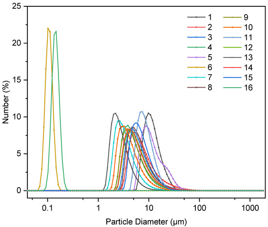 As shown in Figure 1, the PSD of all the 16 groups of synthesized C-S-H/PCE nanocomposites presents a single peak distribution. The PSD of two out of 16 groups varied in the range of the nanometer scale so that the median size of group 6 was 111 nm while the median size of group 16 was 150 nm. In contrast, the PSD of the other groups was in the range of the micron scale so that the median size ranged from 2 μm to 12 μm.