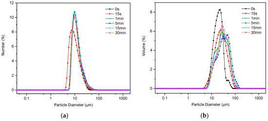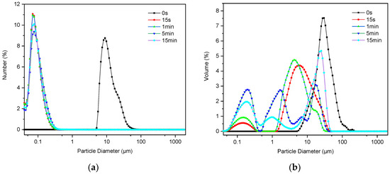 Particle size distribution of group 1 in (a) number and (b) volume.