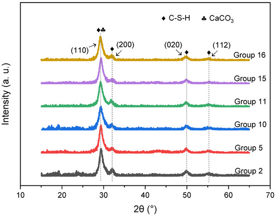 In this work, 6 out of 16 groups of C-S-H/PCE samples were selected for XRD analysis, as shown in Figure 4. Basically, no difference was observed in diffraction patterns among the groups. Thus, the change in synthetic variables had little influence on the composition of the products. Four characteristic peaks near 29°, 32°, 50°, and 55°, corresponding to (110), (200), (020), and (112), respectively, crystal planes of the product C-S-H, were identified. However, the widening of these peaks indicates a low crystallinity degree of the C-S-H. Peaks derived from calcium carbonate were also detected, indicating slight carbonization during the synthesis process.
