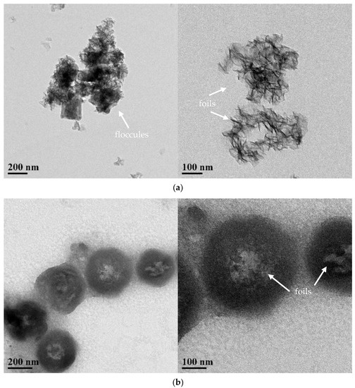 TEM results on groups 2, 10, and 15 are shown in Figure 6. Both group 2 and group 15 showed flocculent structures with different sizes of particles formed by foil agglomeration (Figure 6a,c), which was similar to the floc observed in the SEM images (Figure 5). The large difference in the size of the flocculent aggregates could be due to an uneven dispersion of the particles. In contrast, group 10 showed regular spheres connected in chains (Figure 6b). The size of the spherical particles is relatively uniform. Moreover, foils were identified at the center of the spheres, indicating that these spherical particles were probably formed by the agglomeration of foils, which were found in groups 2 and 15. The difference in the morphology between group 10 and other groups could be attributed to the varied mode of agglomeration of particles. Plank et al. [25] also reported the phenomenon of spheres transforming into nanofoils for synthetic C-S-H.