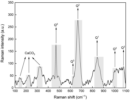 Since a similar pattern was obtained for all groups, a representative Raman spectrum of group 5 was presented (Figure 7). There were multiple peaks less than 320 cm−1 that were probably due to the vibration Ca-O polyhedral, indicating the presence of CaCO3. This is consistent with the XRD results. The peak at ~470 cm−1 was primarily attributed to internal deformations of the SiO4 tetrahedra. In the Si–O–Si symmetrical bending region, there was a broad band in the range from 615 cm−1 to 700 cm−1 and is assigned to linkages involving Q2 and Q3 tetrahedra. Another broad band at ~ 840 cm−1 caused by symmetrical stretching of Si-O was assigned to Q1 sites. The peaks at ~1000 cm−1 and ~1080 cm−1, which were also caused by symmetrical stretching of Si-O, could be assigned to Q2 and Q3 tetrahedra, respectively. It can be noted that the signal of Q1 is considerably lower than the signal of Q2. According to John et al. [42], The mean chain length of silicate, which was calculated from the Q1 to Q2 ratio, decreased with an increasing Ca/Si. When the Ca/Si was higher than 1.2, most of the silicate chains were dimeric. Since the Ca/Si was fixed at 1.5, a low degree of silicate polymerization can be expected in this study.