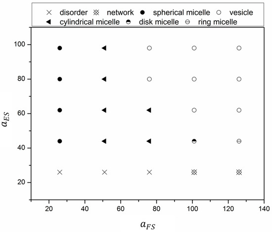 To illustrate the effect of the interaction energy between blocks and solvents, equilibrium structures for various and are presented in Figure 2 in the form of a state diagram. At low (= 26), when the interaction energy between the F block and solvent was low (76), polymer chains favored the solvent, and a disordered structure was found in these cases. As increased from 111.0 to 126.0, the F blocks became relatively solvophobic and started to aggregate. Since E blocks and O blocks are solvophilic, the chains swelled in the solvent and entangled to form a network structure. For cases with higher (> 26), the equilibrium morphologies were mainly governed by short F blocks when was low (). Polymer chains self-assembled to spherical micelles at low (= 26), while cylindrical micelles did so at high (= 51). For further increased , low and high favored the formation of micelles and vesicles, respectively. Although amphiphilic polymers could self-assemble into vesicles with hydrophilic fraction 35%, our results showed that the solvophobicity of the hydrophobic blocks also played an important role in vesicle formation. Note that the length ratio between E blocks and F blocks was 6:1; thus, the solvophobicity of the shortest F blocks played a more important role in the formation of vesicles.
