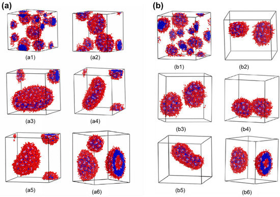 The integration of the equation of motion (Equation (1)) was carried out using the Velocity–Verlet algorithm [33] with a timestep of . For simplicity, we set the cutoff radius, the particle mass, and the temperature as the units of the simulation system, i.e., . Therefore, the unit of time is. Periodic boundary conditions and NVT ensemble were adopted in the simulation. For, is chosen according to the linear relationship with Flory–Huggins parameter proposed by Groot and Warren [33,34].