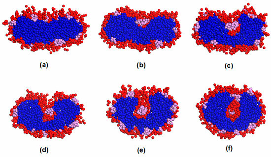 Figure 3(b5) shows the formation of a cylindrical micelle. The micelle was formed by the collision of two vesicles. Both vesicles had a hydrophobic core inside. Figure 7 shows the cross-sections of morphology transition after the combination of the two vesicles. The compatibility among the three blocks thereby led to a gradual rearrangement of polymer composition and curvature (Figure 7b–d). As a result, a complete hollow vesicle formed (Figure 7f). The morphology transition from a cylindrical micelle to a vesicle was also observed by Narayanan et al. [7] at a lower polymer concentration. Nevertheless, the evolution process from a cylindrical micelle to a hollow vesicle in our study was different. For clarity, the shape transformation of the micelles is evaluated by its principal moments of inertia, ; here, we use the normalized principal moments of inertia, and . Typically, spherical aggregates would have and 1, while and correspond to a cylinder and a disk, respectively. In Figure 8, two parent micelles touch at = 0 (corresponding to Figure 3(b4)), forming a daughter micelle, a structure with long , short , and . The resulting aggregate elongated in length to form a cylindrical micelle. The cylindrical micelle restructured and curved to form a spherical vesicle. In the reported experiment, the cylindrical micelle first grew to a certain length and formed a torus-like micelle. Then, the torus micelle merged to form a hollow structure. In our simulation, we did not observe the formation of a torus micelle. Overall, the diffusion of solvophilic O blocks caused the structural transition from a disk-like micelle to a vesicle with a core. Such vesicles merged to form a cylindrical structure. The cylindrical structure eventually bent to form a hollow vesicle. The vesicle with a core could be regarded as an intermediate state during our vesicle formation process.