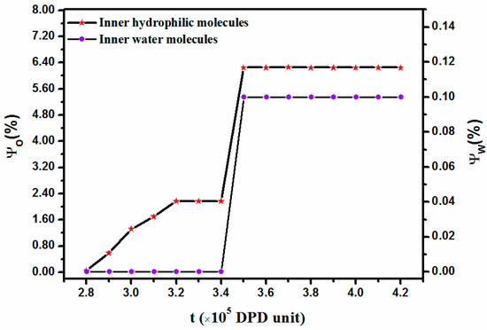 For clarity, the morphology transition from a disk-like micelle to a vesicle with a core over the period of 2.8 × 105 to 3.5 × 105 DPD steps at a low concentration is displayed in Figure 5, in which an interesting finding is observed regarding its structural evolution. For more simplicity, only the cleaved structure of the aggregate is exhibited. As shown in Figure 5a, the micelle exhibited a disk-like structure with an E-bead center surrounded by a shell made mainly of O and F blocks. This stage was followed by the diffusion of solvophilic O blocks into the micelle interior. To better understand the evolution process, the variations in the diffusion number of the solvophilic O block and solvent as a function of time are displayed in Figure 6. In the figure, represents the number of interior solvophilic O beads as a percentage of all solvophilic molecules of the micelle and represents the number of interior solvent content as a percentage of all micelle molecules. Figure 6 clearly shows that the number of interior solvophilic O beads steadily increased over the period of 2.8 × 105 to 3.2 × 105 DPD steps, which corresponds to the dynamic processes described in Figure 5a–d. This process is similar to the previously described Mechanism II, in which the solvophilic block in the exterior of the micelle diffuses into the center (nucleation) and results in the formation of a semivesicle. Since the O beads gradually diffused toward the center of the aggregate, the central E beads were excluded to the sides, which led to the bending of the semivesicle (Figure 5d). Once the semivesicle reached a certain curvature, the diffusion of O beads stopped, shown in Figure 6, in which a constant value (about 2.1%) for the number of O beads inside the structure (from 3.2 × 105 to 3.4 × 105 DPD steps) was observed. The curved semivesicle closed spontaneously. The closure of the structure resulted in a step change for the percentage of inner O-beads in the micelle (Figure 6). According to Figure 6, solvent molecules, though not many, were found inside the structure after the closure of the semivesicle. Learning from Figure 5f and Figure 6, we know that the vesicle with a hydrophobic F block core formed during this stage. Such a special structure was also reported by Wang et al. in a study of the self-assembly of star terpolymers by the SCFT method [29]. In their work, a vesicle with a core was formed due to the aggregation of shorter solvophobic blocks at the center during vesicle size enlargement. In our simulation, the hydrophobic core was formed due to the intrinsic polymer structure. When the O block diffused into the micelle center, the F block, which connected with the O block, deposited simultaneously (Figure 5b–d). The structure was stable for about 74,000 DPD steps.